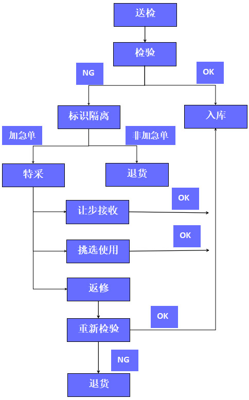 | 采购部 | 特采申请单 | 检验员检查产品不合格,如是非加急单,可退货处理;如是加急单,则提出特采申请。 品质部向供方发布质量信息反馈表 |